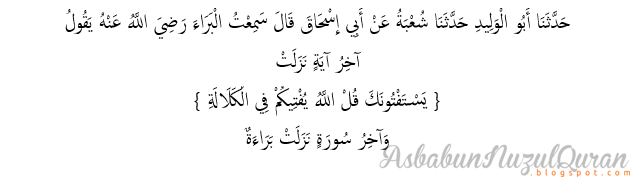Telah menceritakan kepada kami Abu Al Walid Telah menceritakan kepada kami Syu'bah dari Abu Ishaq dia berkata; Aku mendengar Al Bara' radliallahu 'anhu berkata; Ayat yang terakhir kali turun adalah ayat: Mereka meminta fatwa kepadamu (tentang kalalah). Katakanlah: "Allah memberi fatwa kepadamu tentang kalalah. (An Nisa: 176). Sedangkan surat yang terakhir kali turun adalah surat Bara'ah.